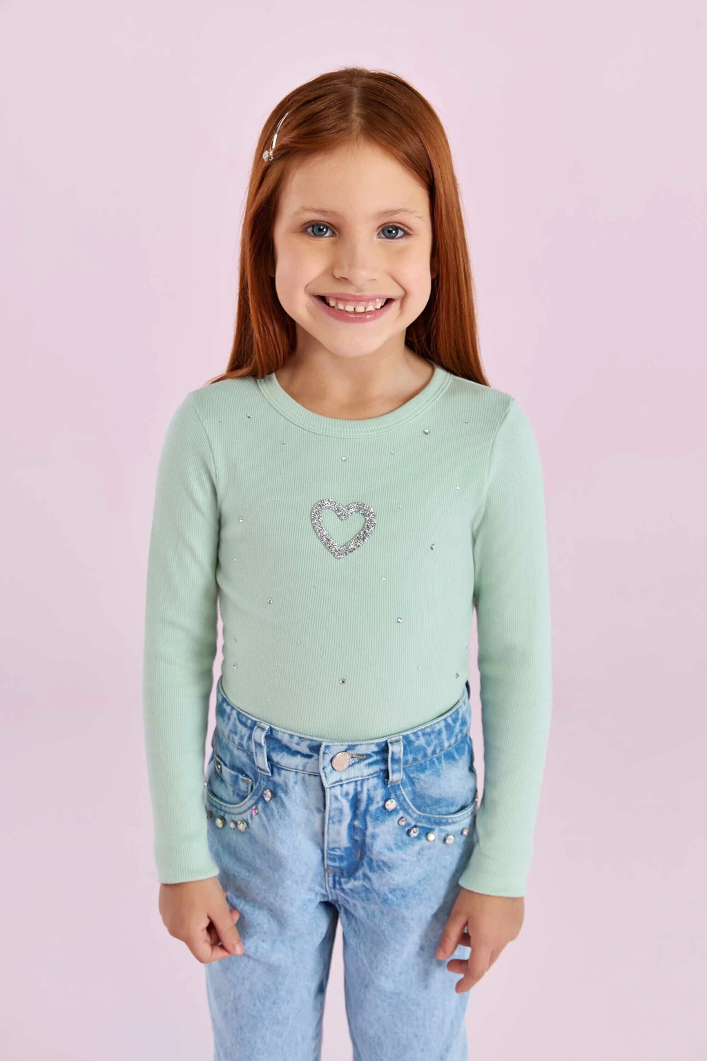 Essa blusa é simplesmente encantadora! Com um tom azul claro e mangas longas, ela é perfeita para compor looks que vão desde o esportivo até o social. O detalhe do coração em strass confere um charme especial, fazendo com que elas arrasem em qualquer ocasião!