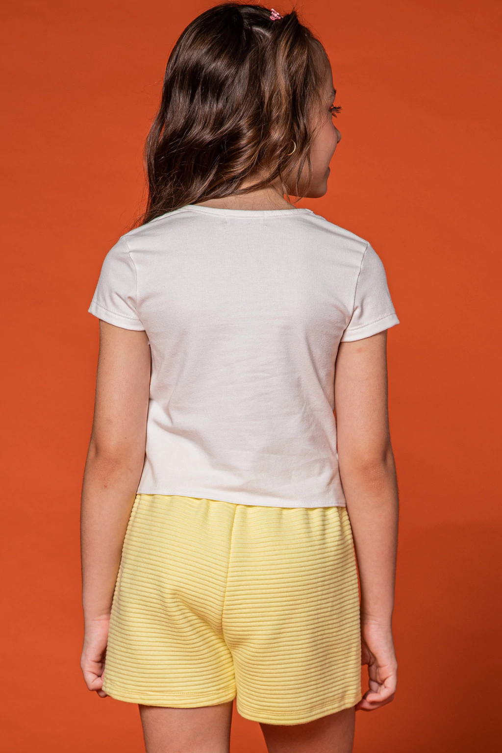 Blusa em cotton, mangas curtas com amarração feita na cintura e brilhos aplicados na escrita.