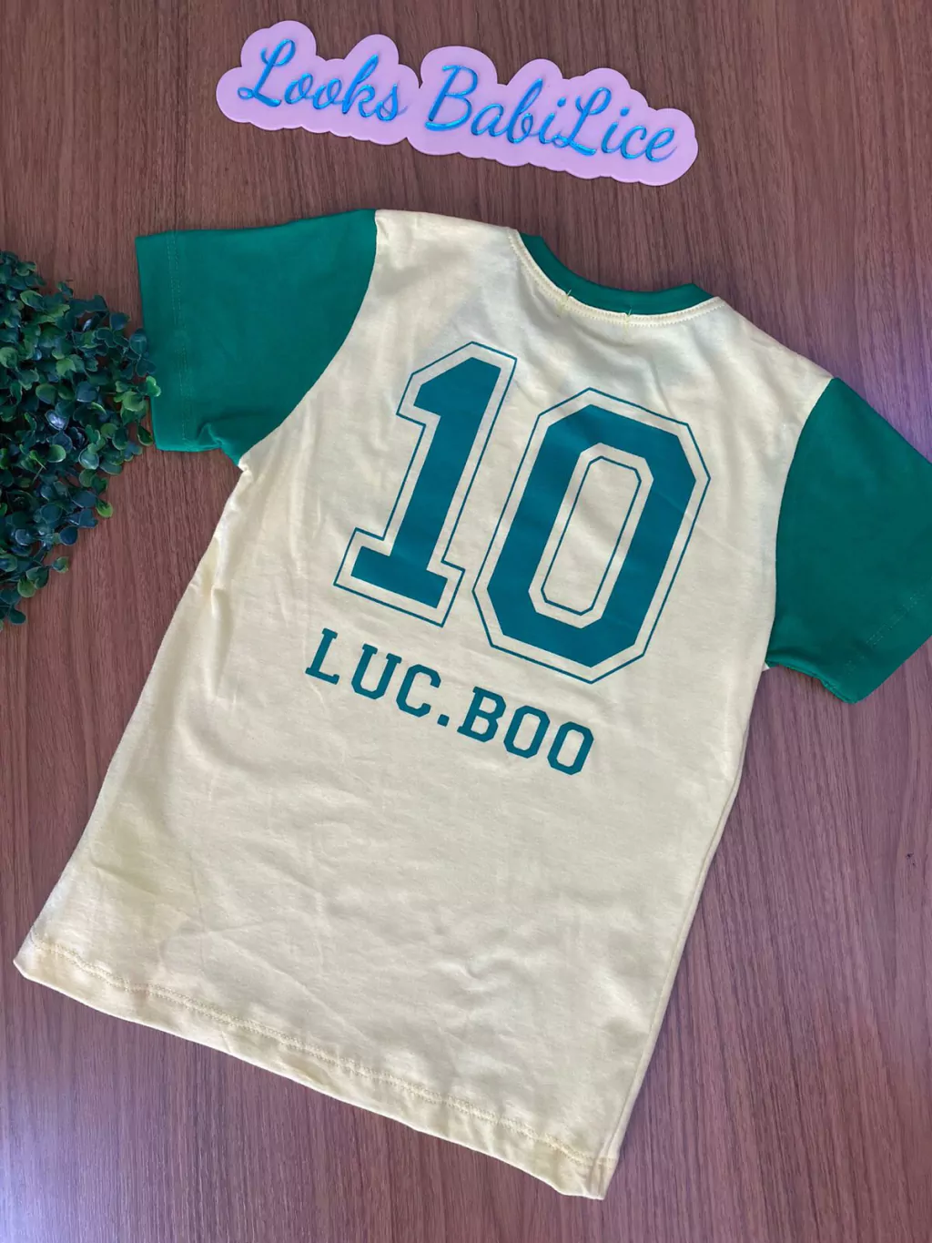 Camiseta / blusa infantil de mangas curtas, recorte de cores: amarelo e verde, estampa de escudo na parte frontal e estampa numérica nas costas.