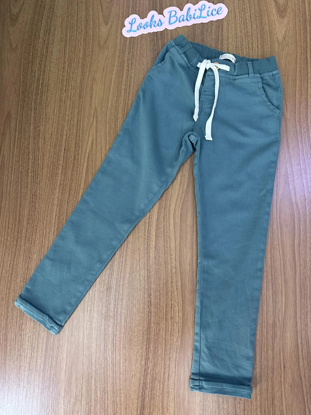 Calça em sarja com moletom, cós de elástico com cordão para maior ajuste e bolsinhos.