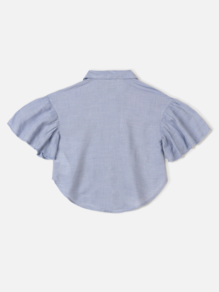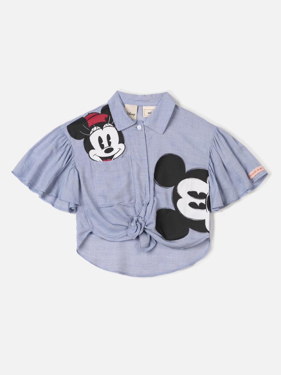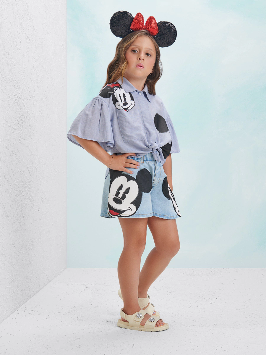 Camisa em viscose, mangas amplas e soltinhas, bolsinho, amarração frontal e estampa divertida do Mickey.