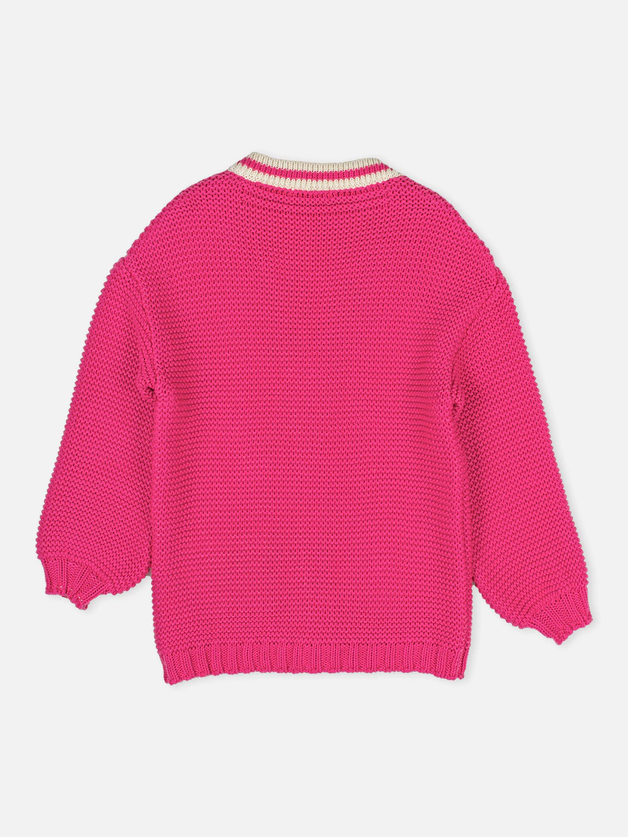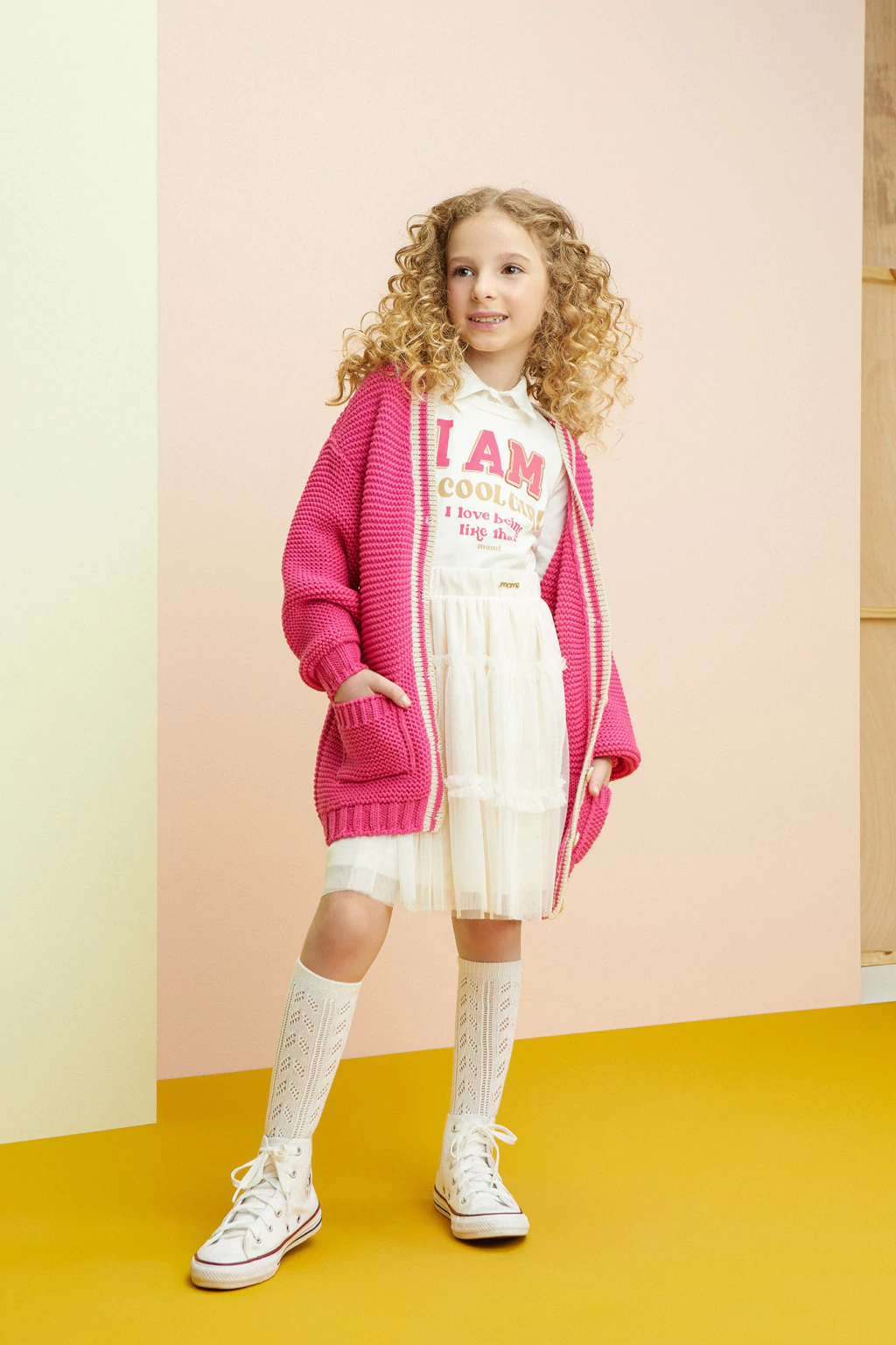 Casaco alongado em tricot com bolsinhos frontais e fechamento por botões.