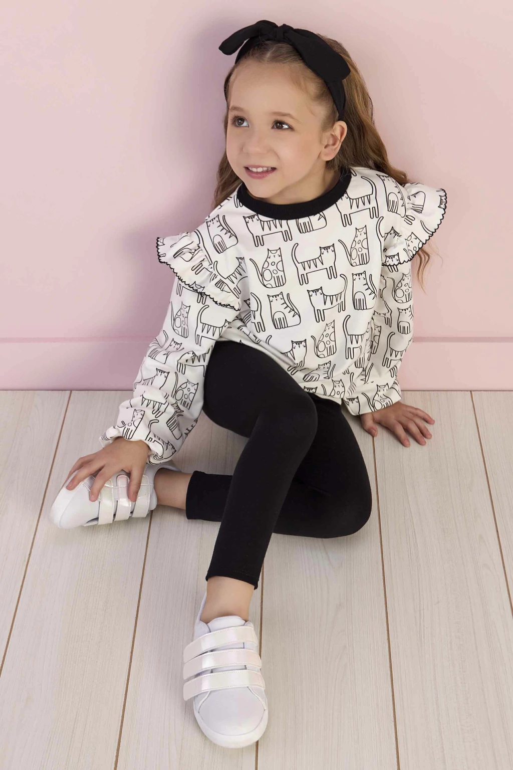 A blusa de mangas longas conta com uma encantadora estampa de gatinha e babadinho nos ombros, garantindo um visual divertido e moderno. A calça legging, por sua vez, proporciona liberdade de movimento, permitindo que sua criança brinque e explore com toda a segurança.