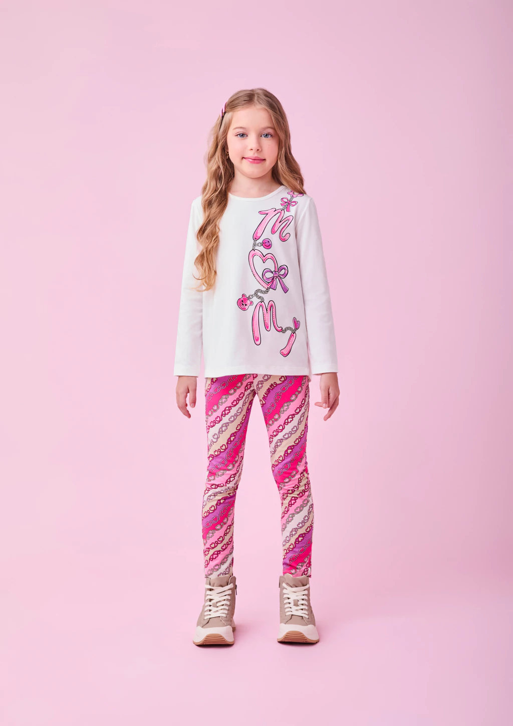 Feito com materiais de alta qualidade, ele garante conforto o dia todo — perfeito para as aventuras diárias, brincadeiras e momentos especiais. A blusa off white, com estampas delicadas e detalhes adoráveis, combina com a legging que traz aquele toque divertido e fashion.