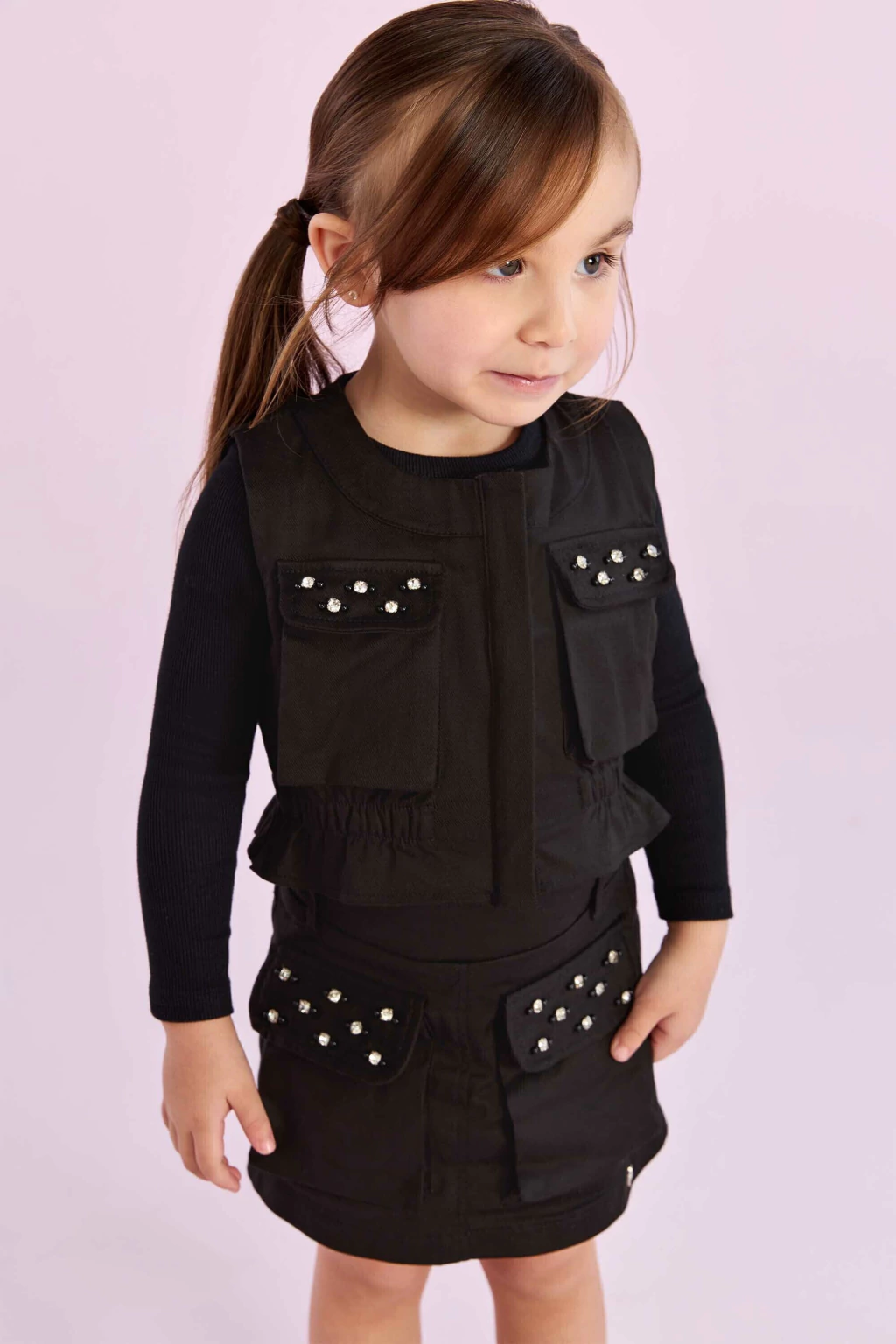 Um conjunto incrível e sofisticado que traz o melhor do estilo para as pequenas! Este conjunto infantil é composto por um croped sem mangas, adornado com um elegante aplique em strass, e um short saia que proporciona conforto e charme.
