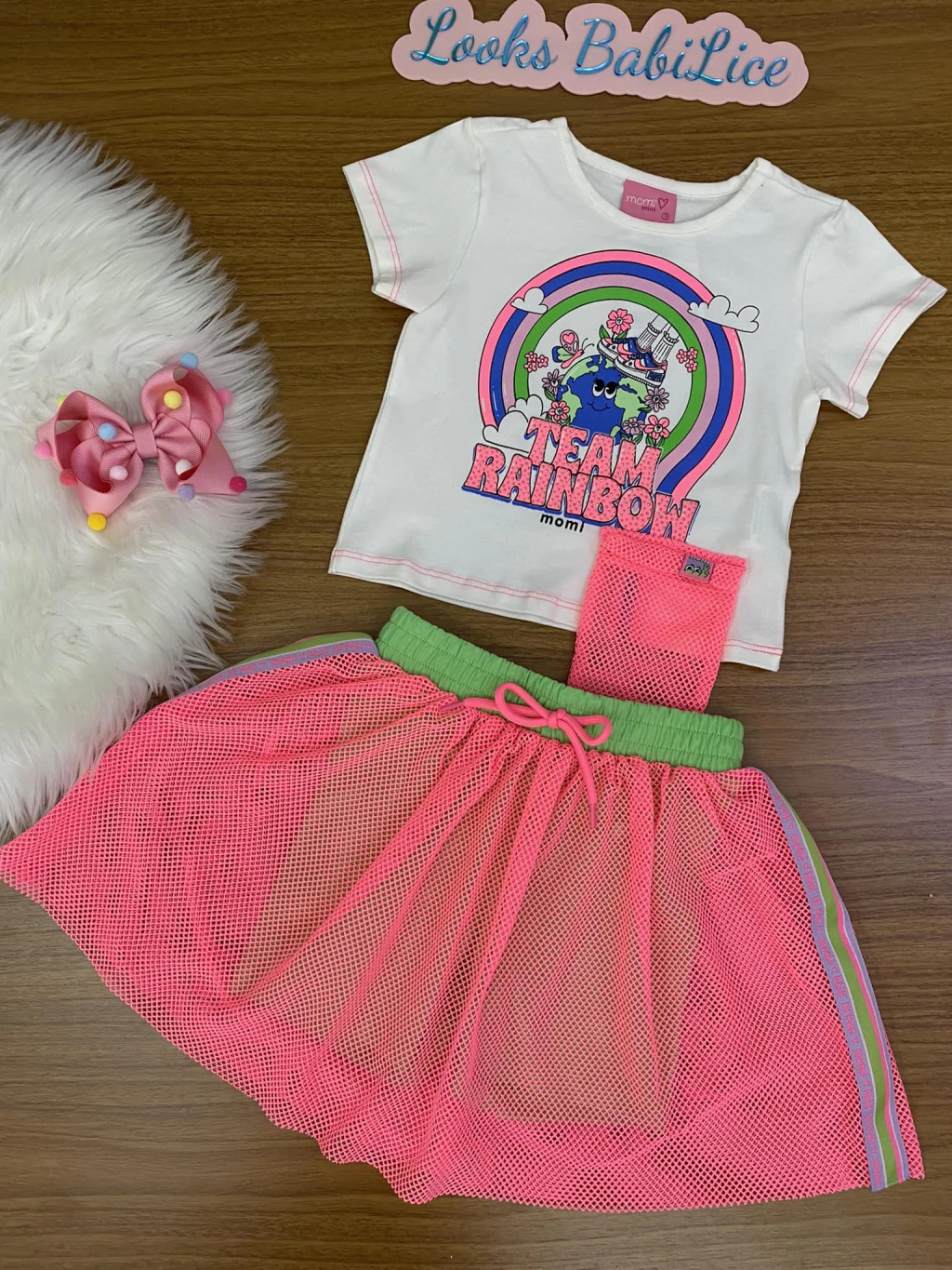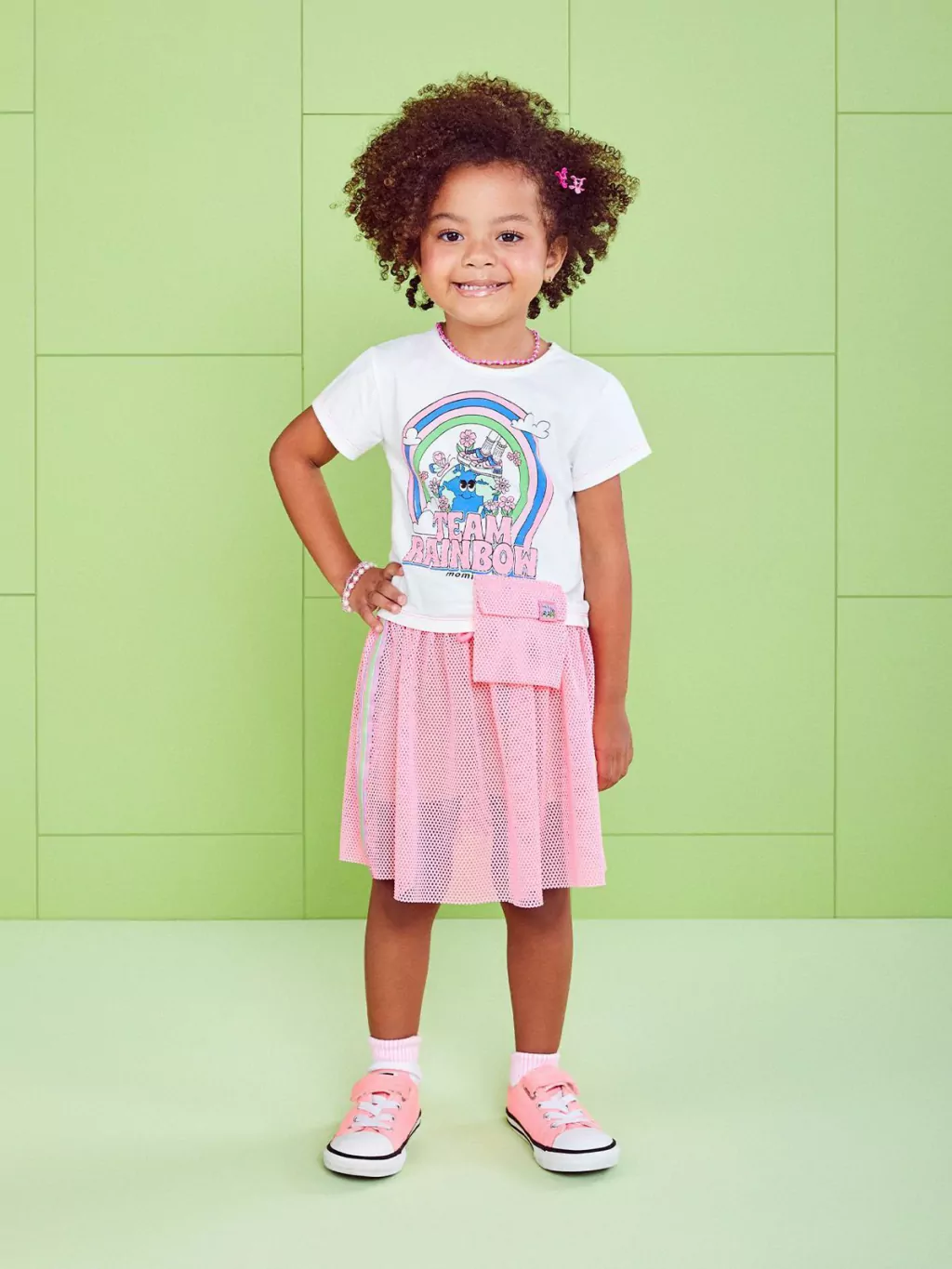 Conjunto composto por: blusa de mangas curtas saia em tela com bermuda em cotton por baixo, detalhe fofo de telinha na blusa.