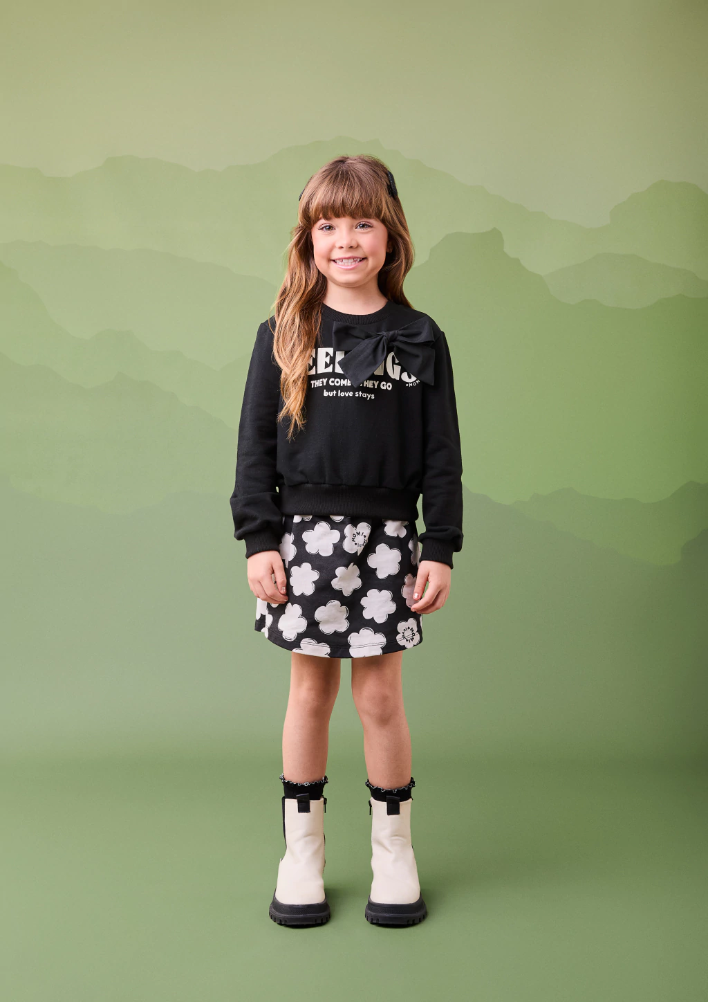 Este look incrível traz uma blusa de moletom off white, decorada com um lindo laço que dá um toque de fofura e delicadeza ao visual da sua pequena. A composição confortável garante que ela possa brincar, pular e sorrir sem parar!