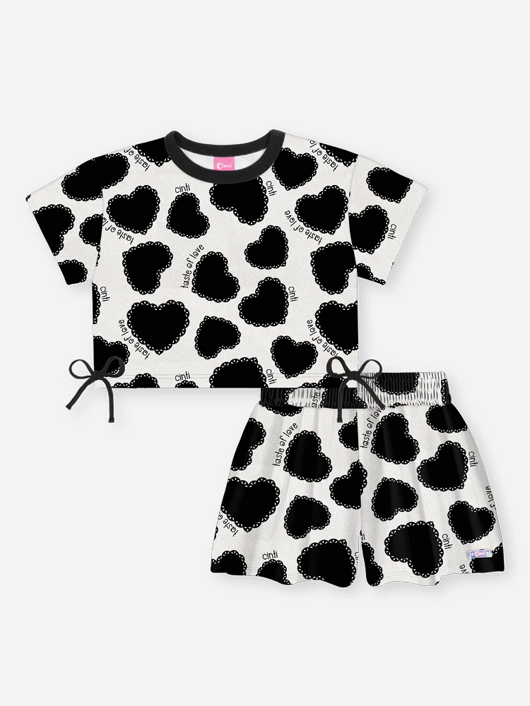 Este conjunto traz uma blusa delicada com um amarradinho lateral que adiciona um toque super fofo e moderno ao visual. Os detalhes em coração complementam o design, combinando a suavidade do branco com a elegância do preto — uma paleta clássica que nunca sai de moda.