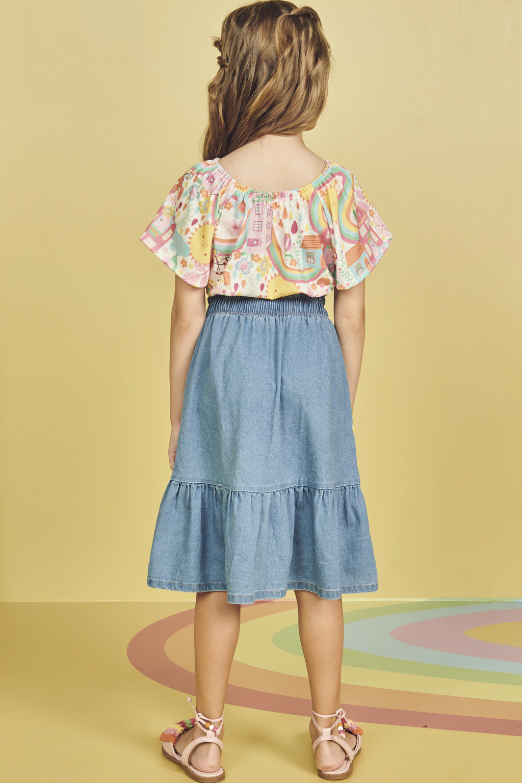 Conjunto composto por: blusa cropped em malha fresh com mangas soltinhas e elástico na cintura; saia midi em jeans e pompons aplicados.