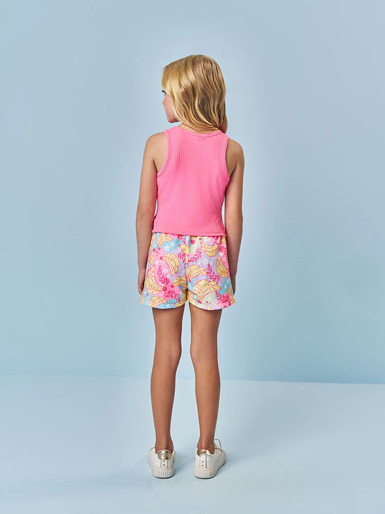 Este conjunto é a combinação perfeita para os dias de brincadeira, passeio ou aquela festinha cheia de charme. A regata em malha é super fresquinha, com uma abertura que facilita na hora de vestir — e ainda vem com um detalhe delicado em miçangas que é puro charme e brilho, do jeitinho que as meninas adoram!