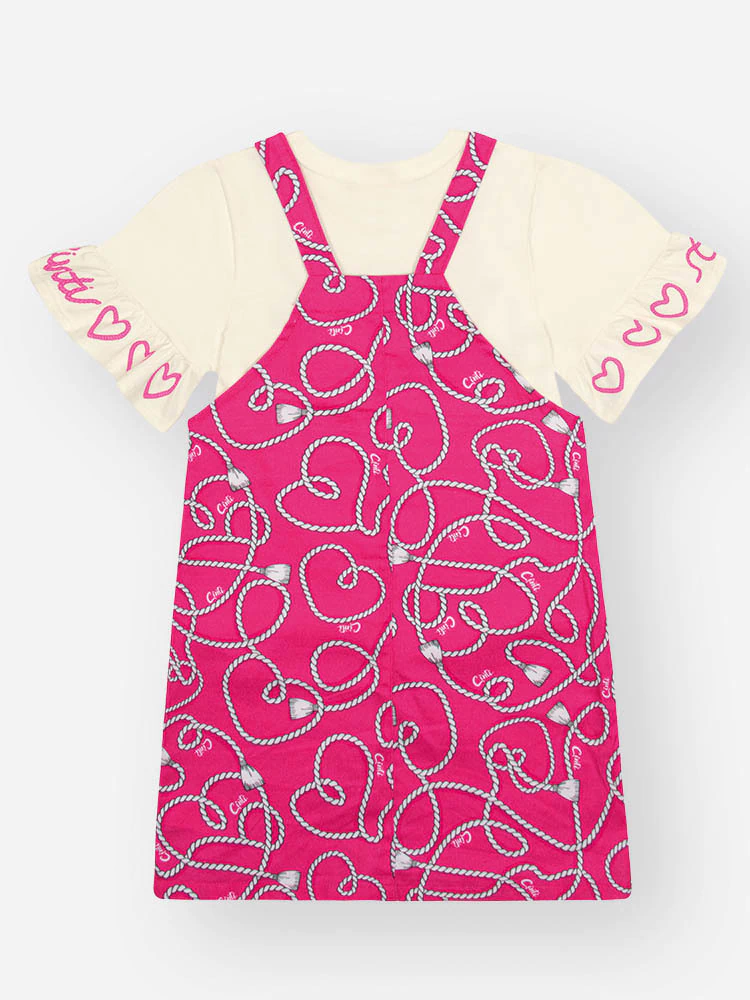 Este conjunto encantador é composto por uma salopete pink estampada, super vibrante, que traz alegria e estilo para o visual da sua filha. A blusa branca, com detalhes delicados de coração na manga, adiciona um toque fofo e moderno, tornando o conjunto irresistível.