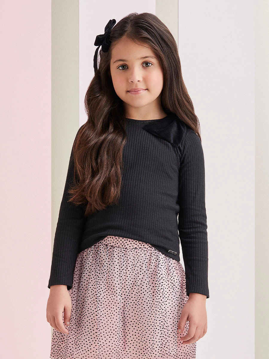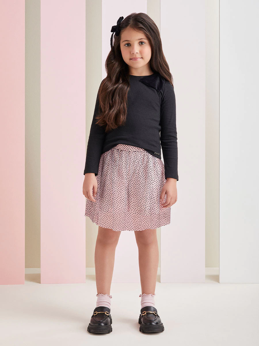 Conjunto Infantil Blusa Manga Longa Preta Tecido Canelado com Detalhe no Ombro e Saia Rosa Sobreposta com Tule Bordado- Momi - (Ref.H5378)