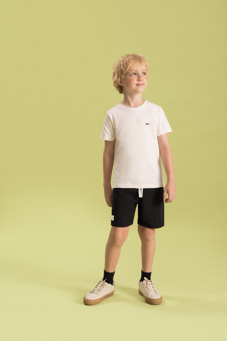 Feito para aguentar muita diversão, o tecido tectel garante leveza e resistência, ideal para os dias de sol e correria no parquinho. A blusa branca é versátil e combina com tudo, deixando seu filho pronto para qualquer aventura com muito charme.