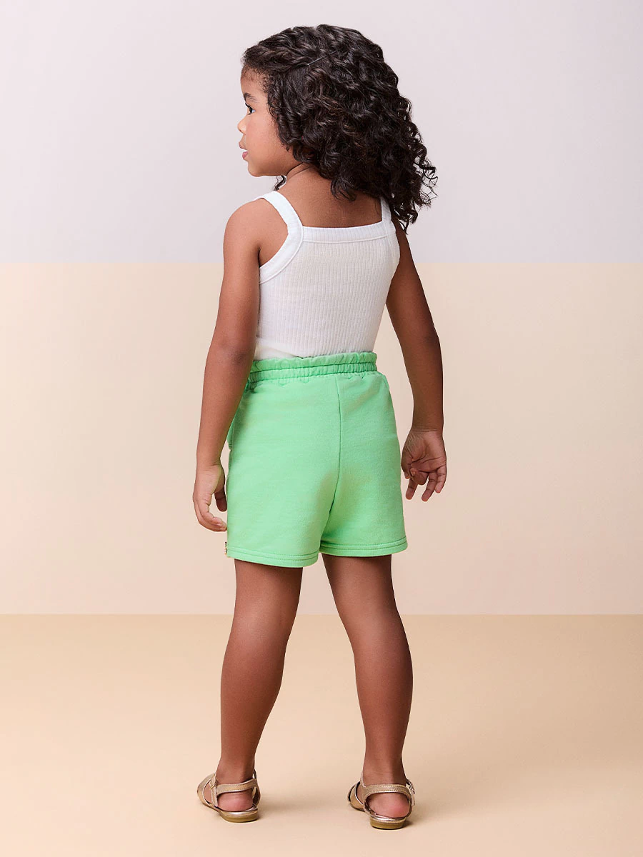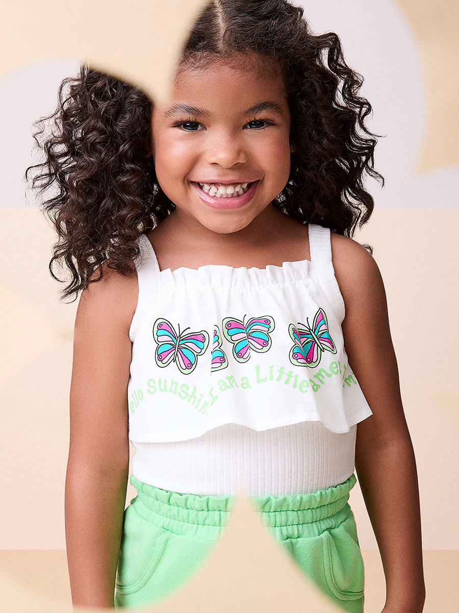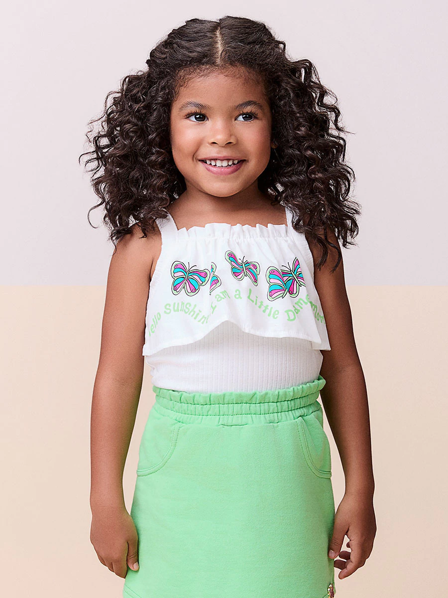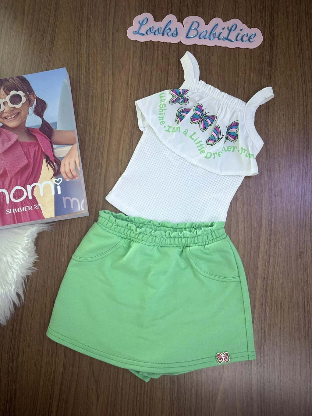 Conjunto Infantil Short Saia Cós Elástico ce Blusa Malha Cenelado Alça e Babado