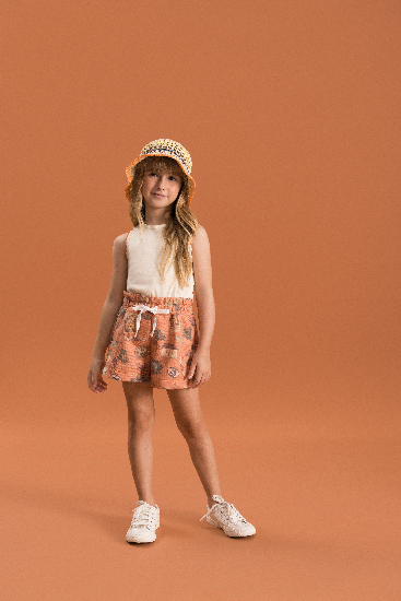 O short estampado traz paisagens no marrom terra cota, perfeito para pequenas exploradoras cheias de estilo. Ideal para brincar, passear e encantar por onde passar!
