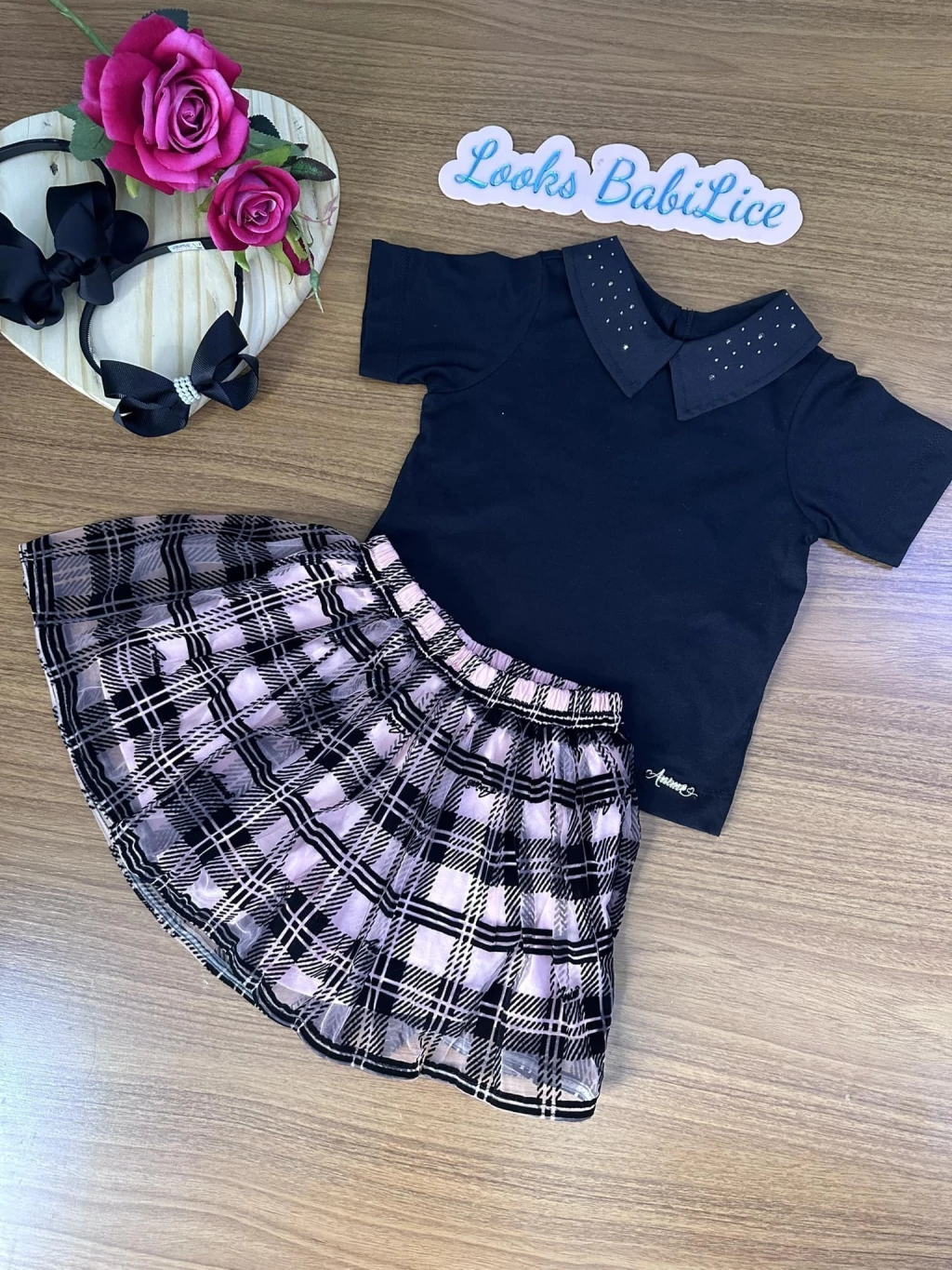 O conjunto infantil Animê é uma expressão de delicadeza para as meninas. A blusa preta, confeccionada em meia malha, destaca-se pela gola adornada com strass, proporcionando um toque sofisticado. A saia de tule xadrez, com forro em meia malha, adiciona charme e leveza ao conjunto. A combinação equilibrada faz deste conjunto a escolha perfeita para ocasiões especiais. Composição - Blusa: 100% algodão. Saia: 100% poliéster. Forro: 100% algodão. Ref.: P5673