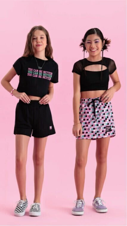 Conjunto composto por: blusa cropped com abertura próximo ao decote, mangas curtas e saia toda estampada com cós de elástico e codarço para amarração na cintura.