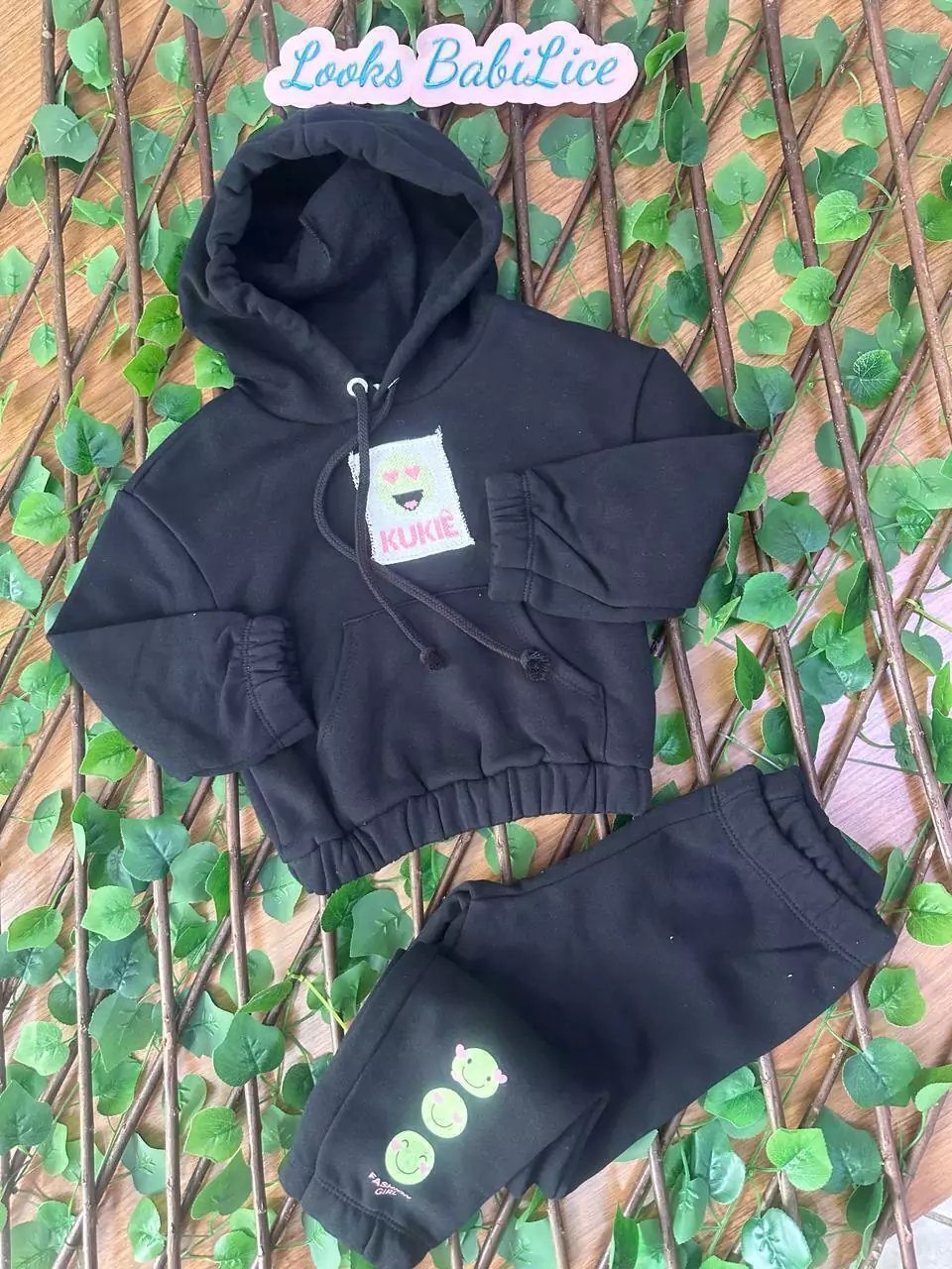 Conjunto composto por: blusão com capuz FLANELADO, bolso canguru e elástico nos punhos e cintura e calça com corte tradicional e cós e barra com elástico. Ambas peças em moletom com pelúcia, no mesmo padrão de cor.