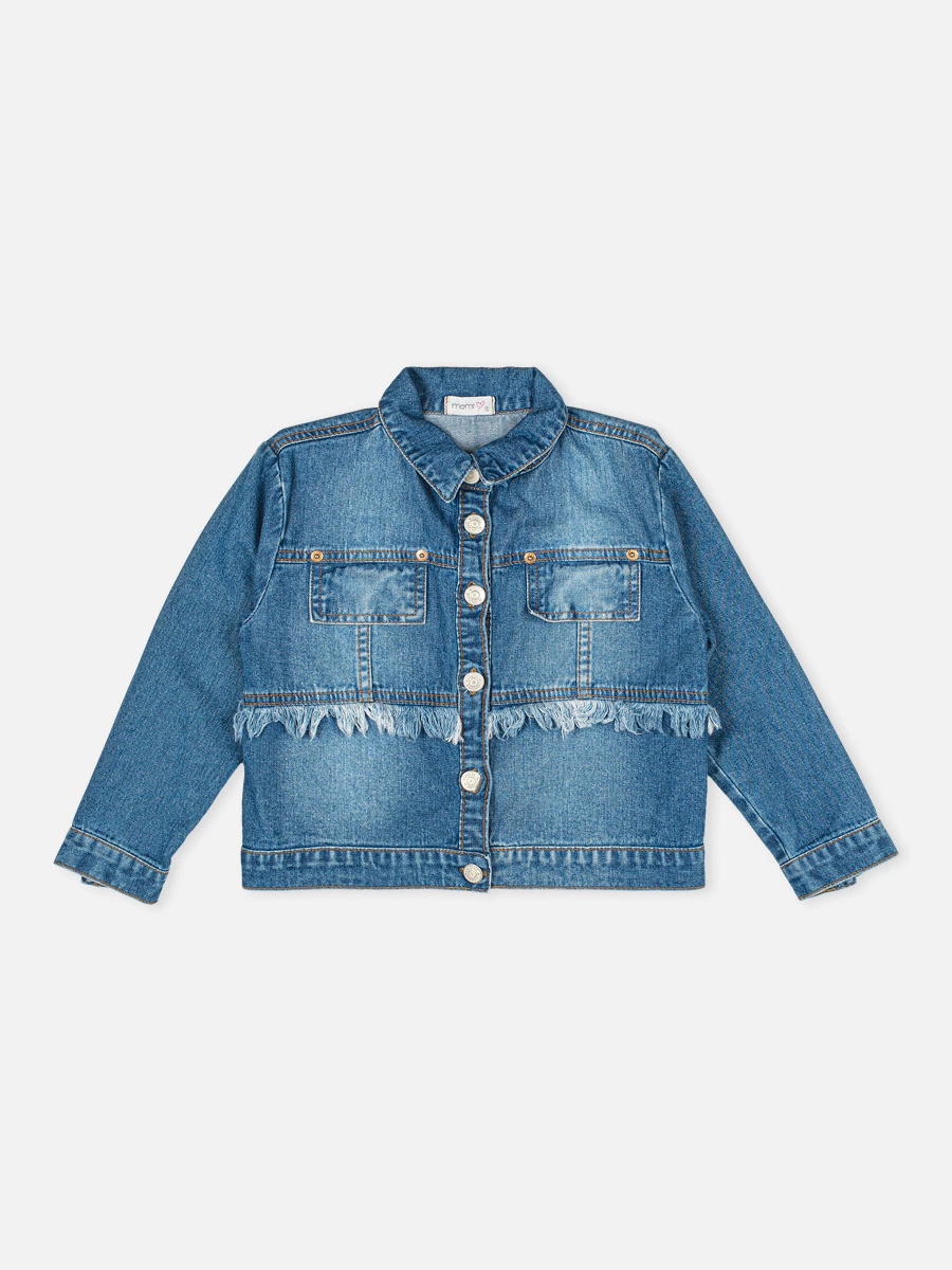 Jaqueta jeans, golinha de camisa, fechamento por botões, bolsinhos "fake" e detalhes desfiados na parte frontal.