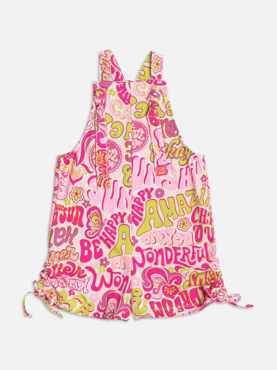 Jardineira com alças e cordões laterais com ajuste por amarração e toda estampada.