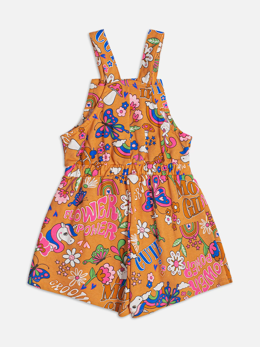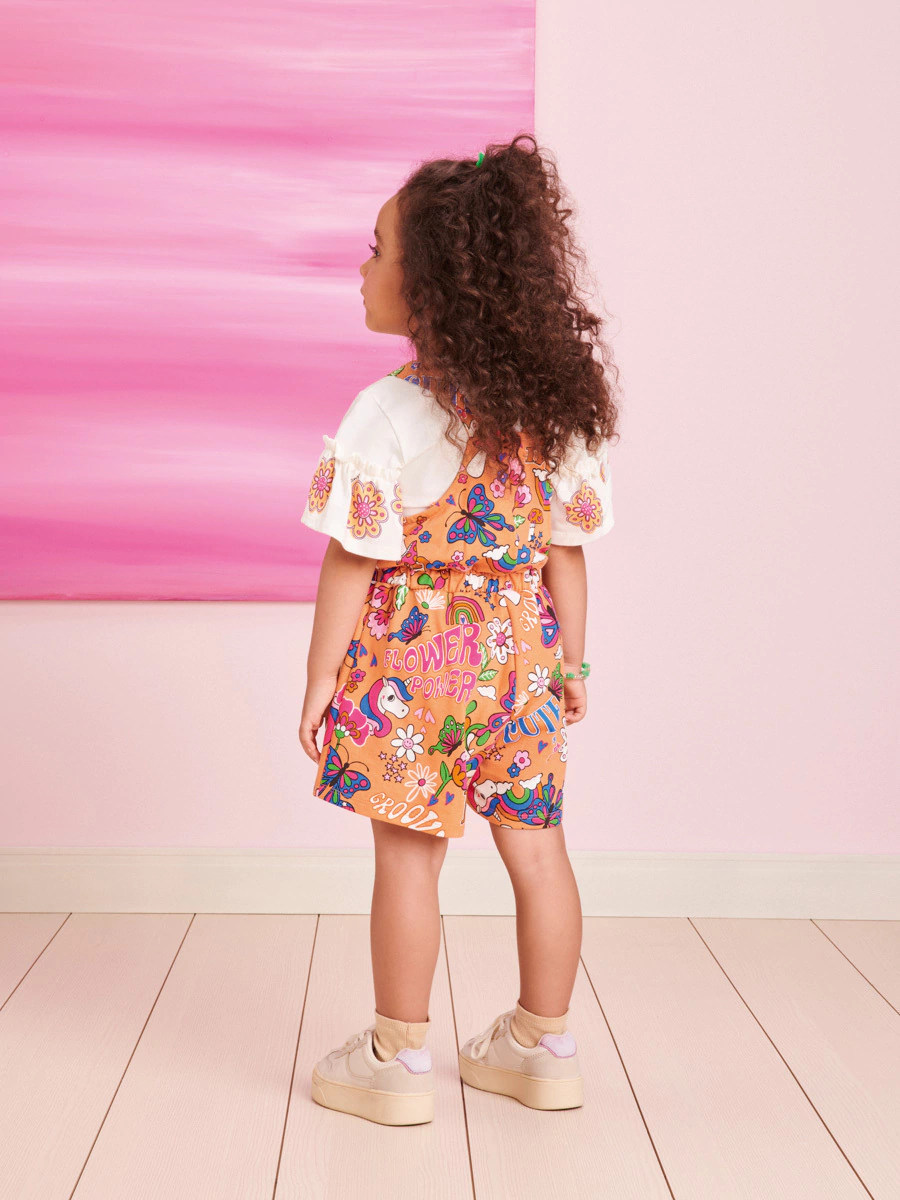 Jardineira curta com ajuste nas alças por amarração e toda estampada.
