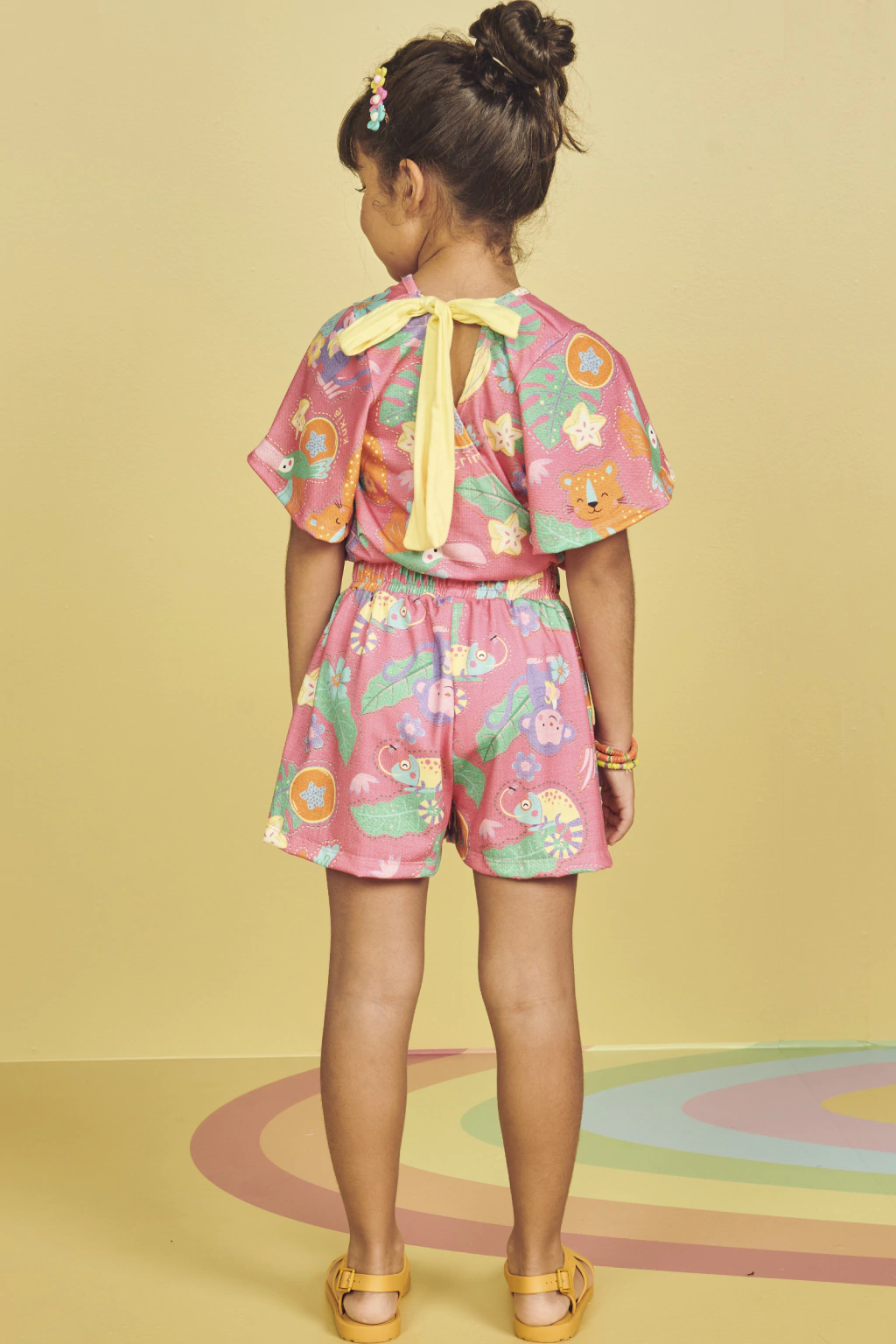 Macaquinho em malha fresh, mangas soltinhas, faixa para laçarote nas costas, elástico para marcar a cintura e todo estampado.