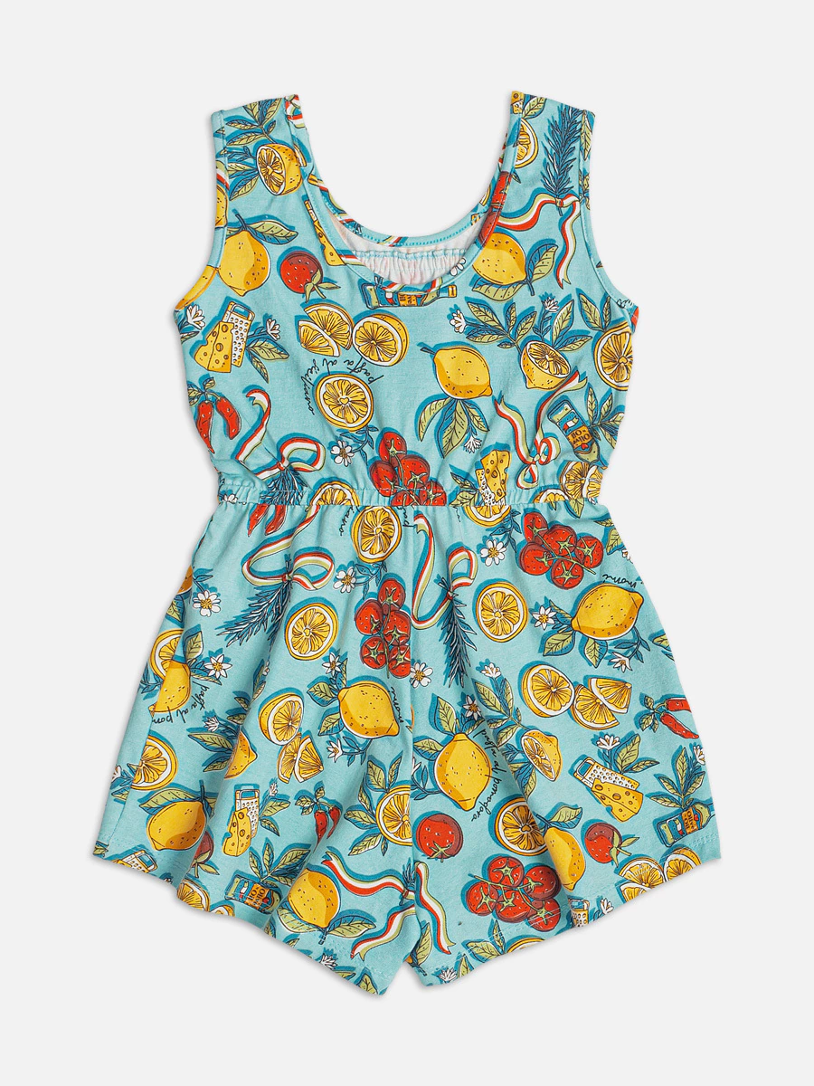 Macaquinho sem mangas, detalhe de franzido no busto, elástico para marcar a cintura e modelagem soltinha.