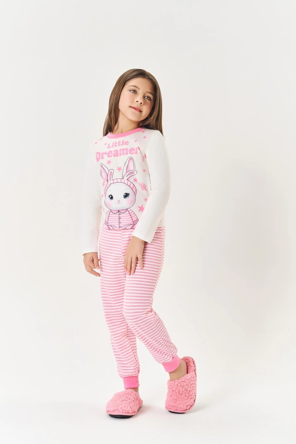 Transforme as noites da sua pequena em momentos de pura diversão e conforto com o Pijama Infantil Calça e Blusa Estampa Coelho. Este conjunto encantador é composto por uma blusa de mangas longas e uma calça com Listras, perfeita para aquecer as noites mais frescas.