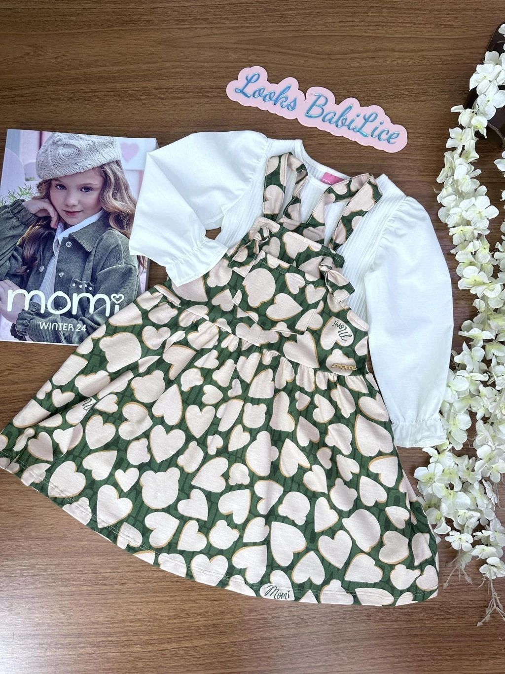 Salopete Saia Rodada, Estampa Coração Ajuste Alças - Momi (Ref. J5545) / Blusa Momi R$ 89,90 (Ref J5463)