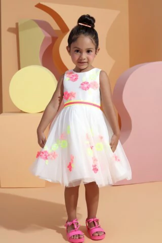 Vestido de festa com saia toda com tule sobreposto, flores neon aplicadas ao busto e saia e faixas também neon na cintura.