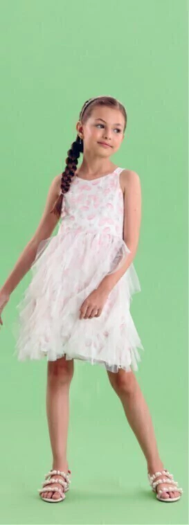 Vestido de alças, com delicado bordadadinhos no busto e camada de tule que sobrepõe a saia.