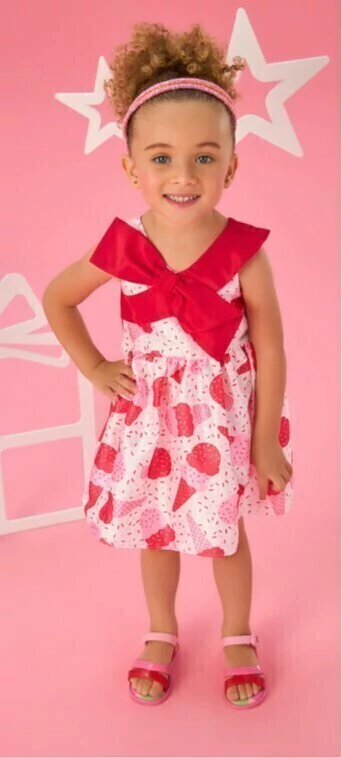 Vestido sem mangas, todo estampado e laço aplicado no busto.