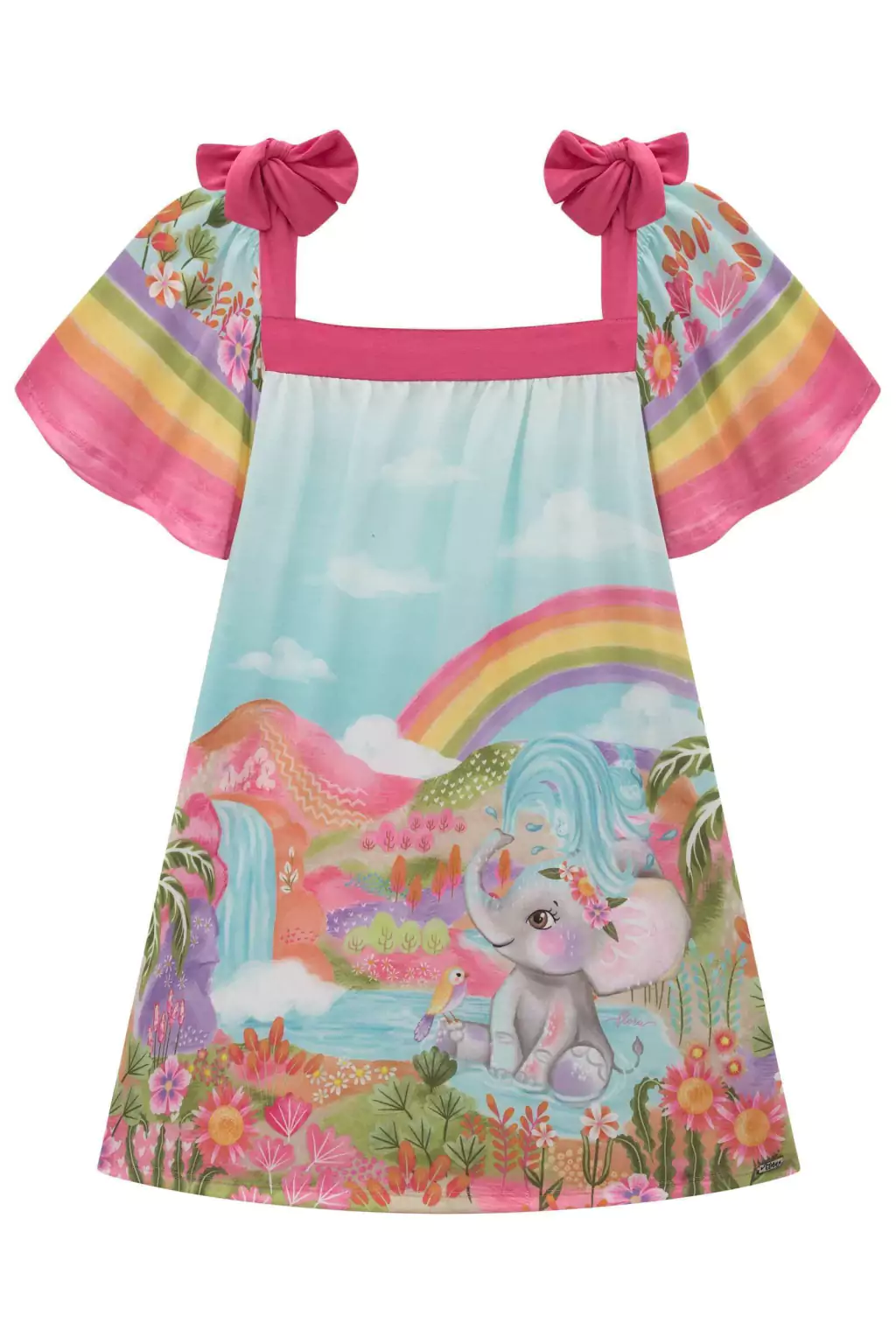 Vestido em Malha Fresh 73721 Infanti. Lacinhos nas mangas, malha macia e estampa linda de bichinhos.