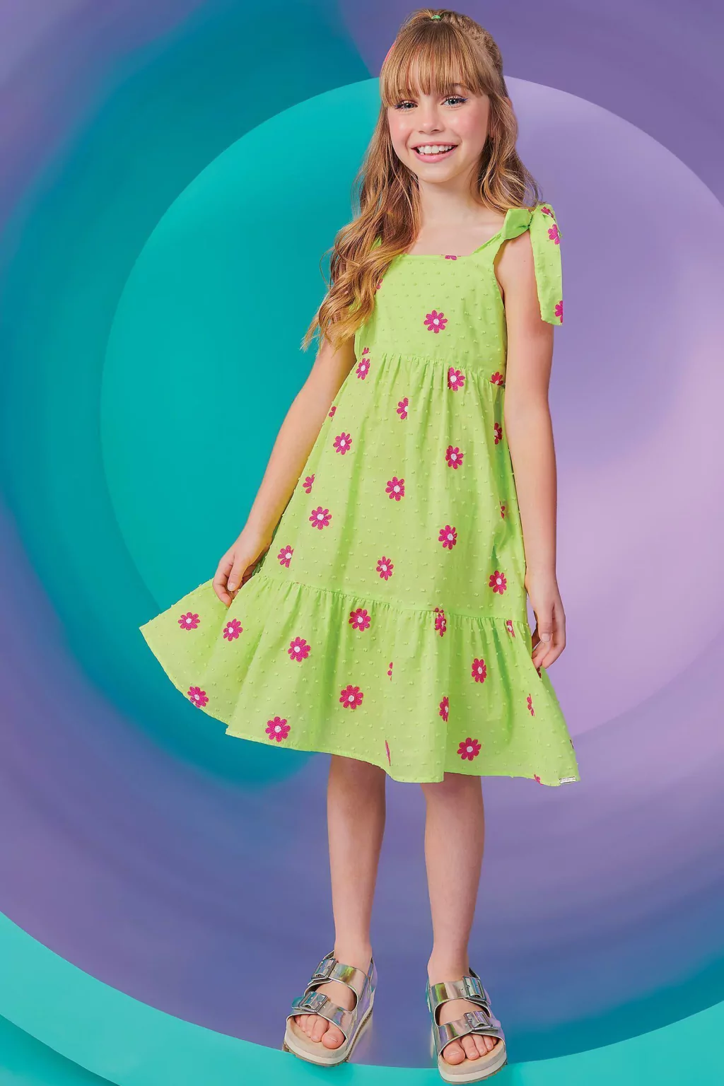 Vestido de alças com ajuste por amarração, tecido leve e com textura (poás), decote mais cavado nas costas, flores bordadas e barrado marcado com franzido.