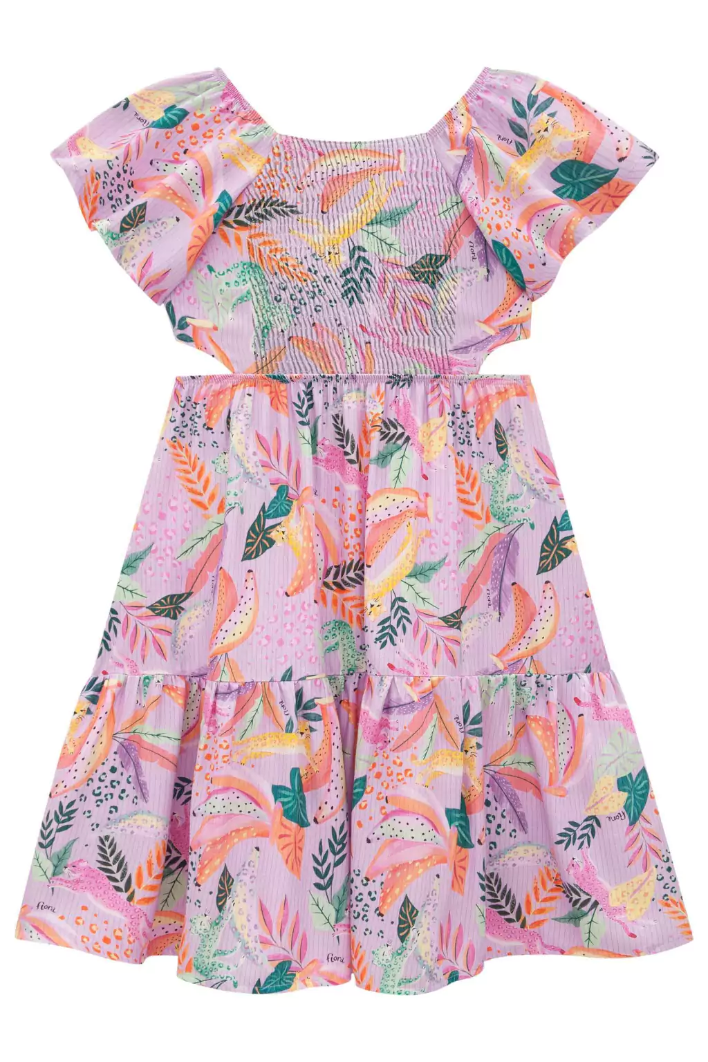 Vestido em viscose, modelo alongado e soltinho, mangas curtas, aberturas laterais na cintura, lastex no centro das costas e todo estampado.