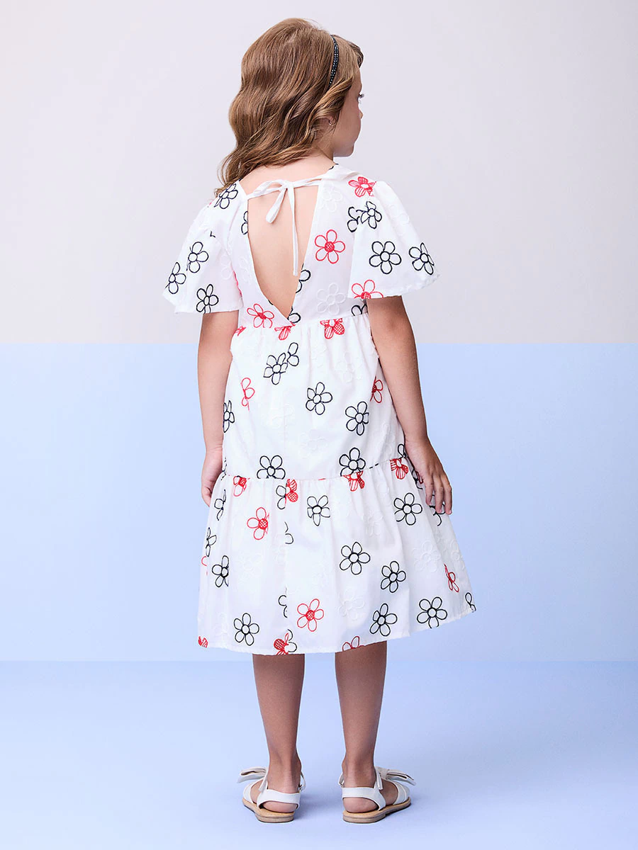Vestido Infantil Branco Floral com Babado e Laço na Cintura - Momi - H5595