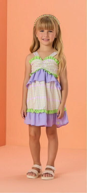 Vestido de alças com ajuste por amarração, decote nas costas, babados aplicados no busto e barrado e recorte de estampa e cores.