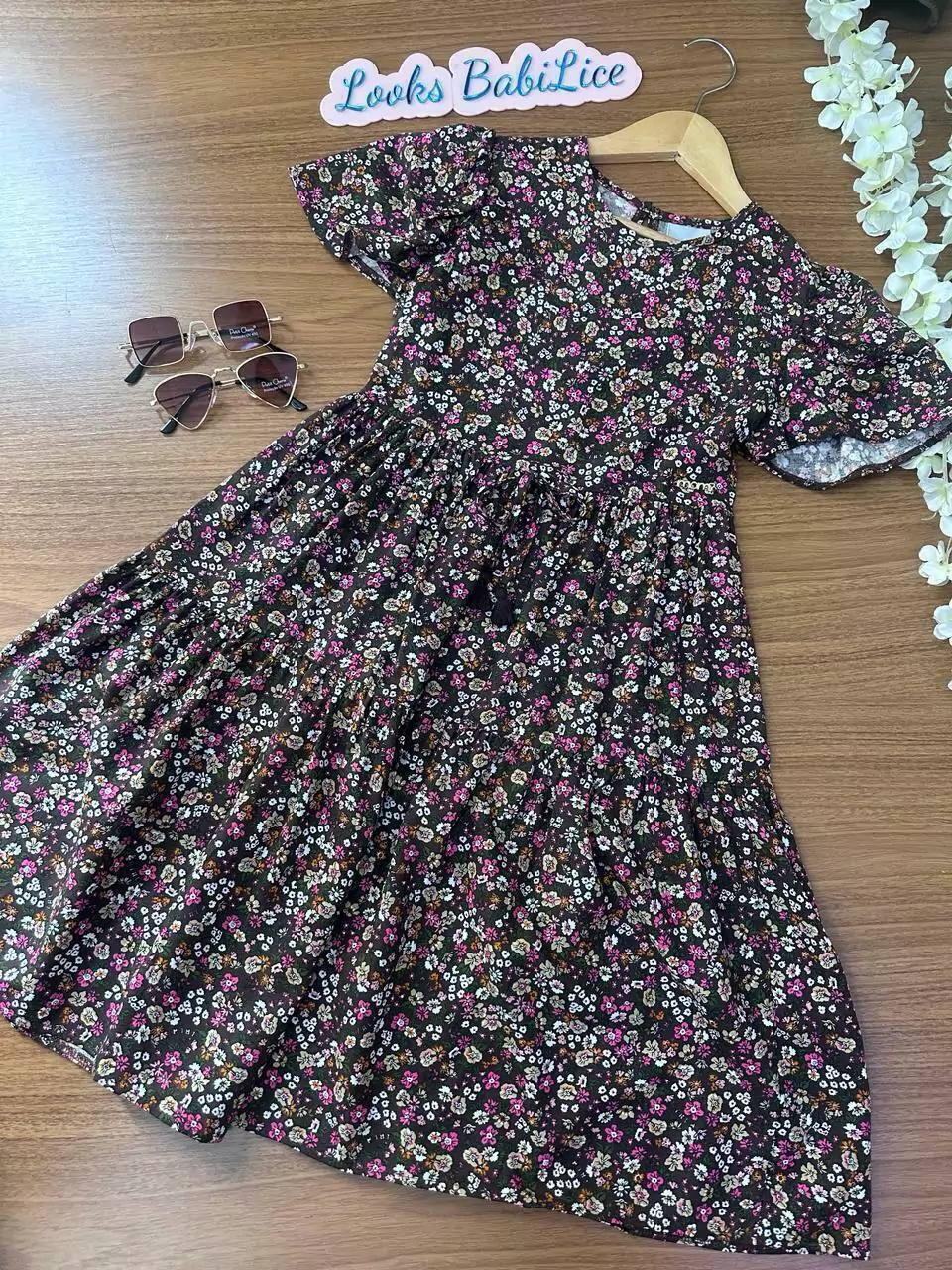 Vestido em tricoline, mangas curtas e evasê, modelagem confortável e todo estampado.