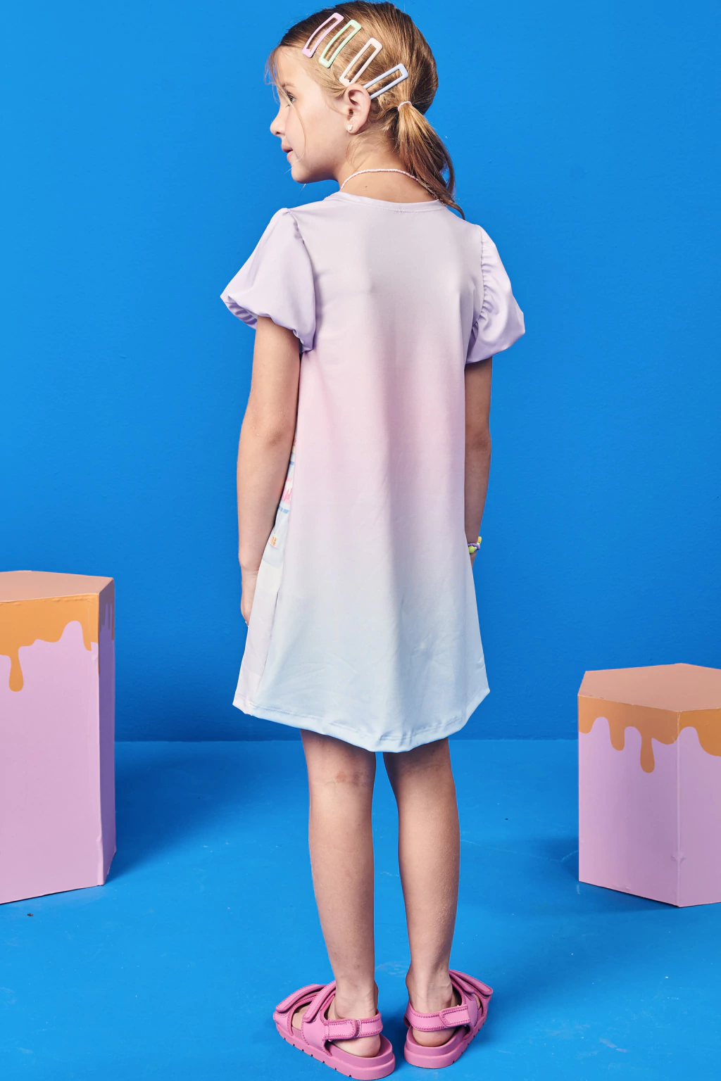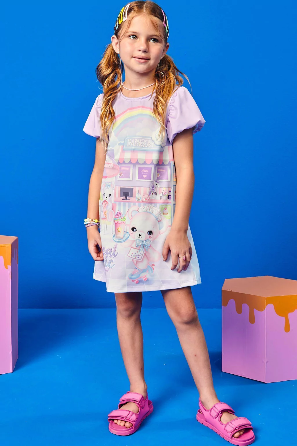 Vestido em neo fresh, mangas bufantes e com estampa fofa.