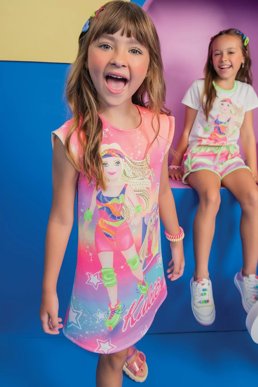 Vestido em fly tech com mangas curtas, corte retilíneo e todo estampado (ambos lados).
