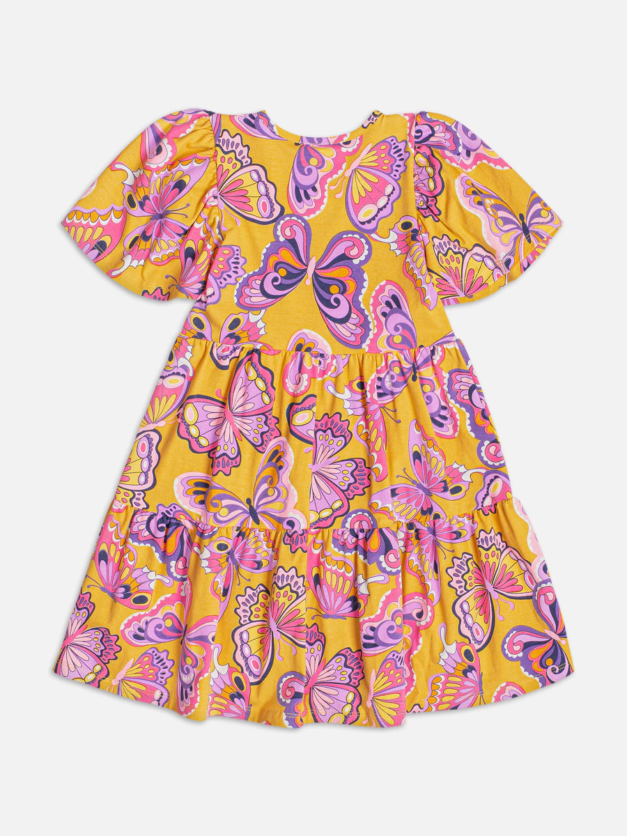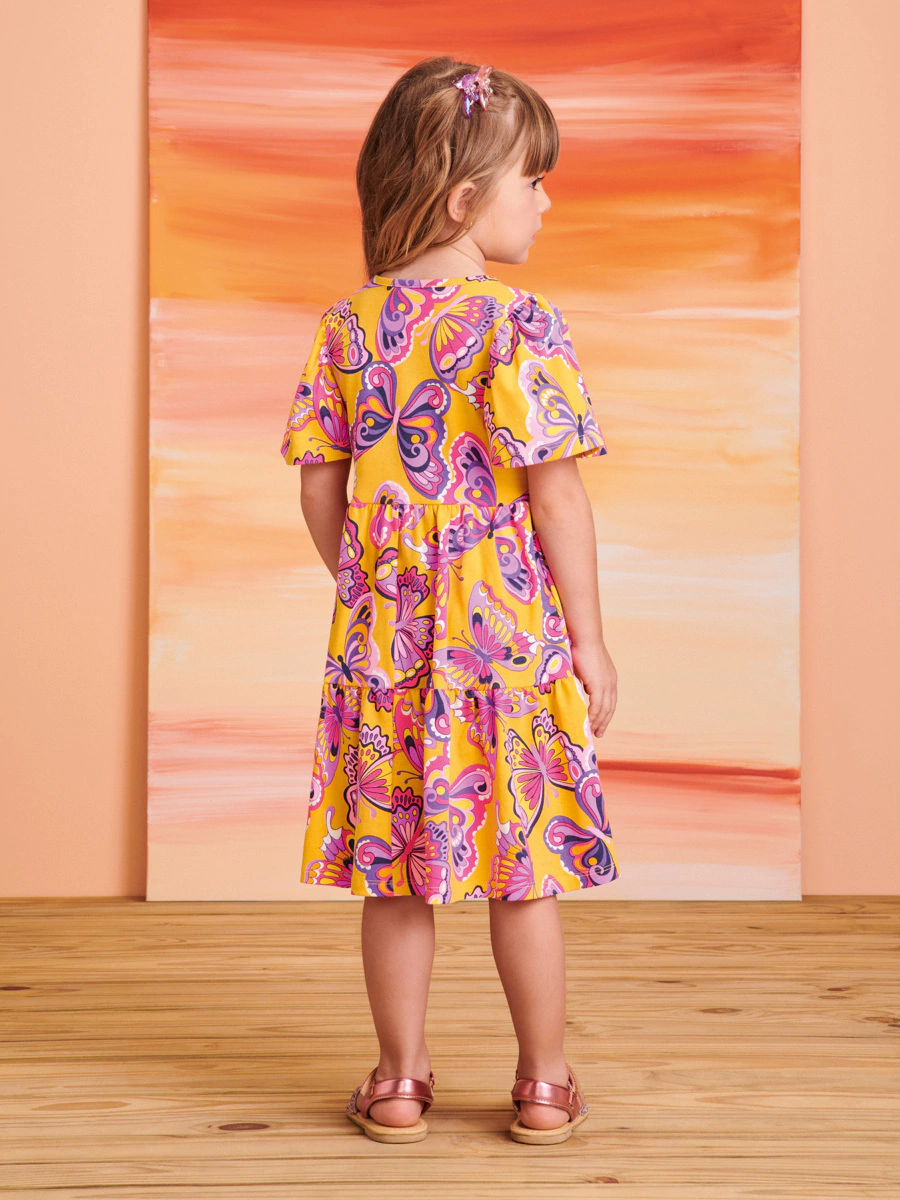 Vestido em malha, mangas curtas, costuras estilo Marias e todo estampado.