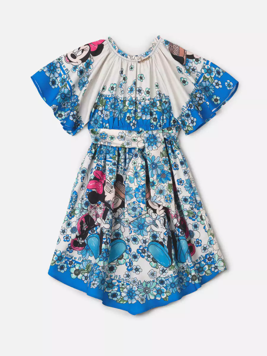Vestido em tecido leve, elástico para marcar a cintura, mangas sino, barra assimétrica e estampa fofa do Mickey e Minnie.